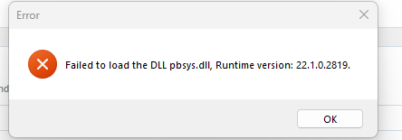 Error. Failed to load the DLL pbsys.dll,m Runtime version 22.1.0.2819.