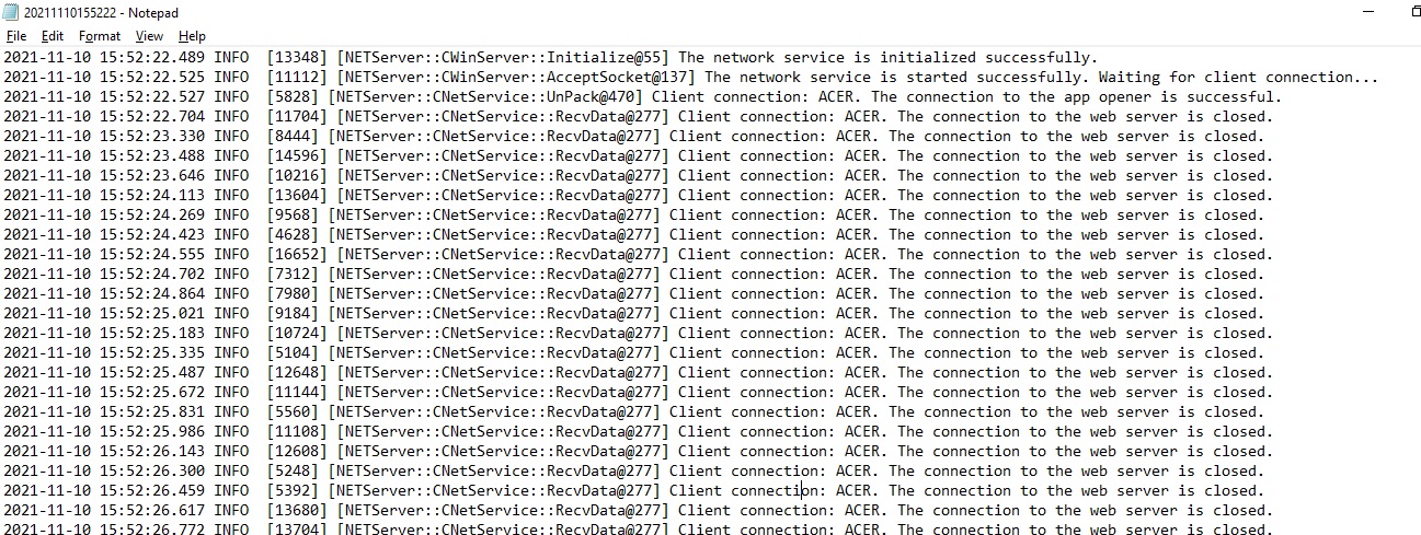 2021-11-10 15:52:22.527 INFO [5828] [NETServer::CNetService::UnPack@470] Client connection: ACER. The connection to the app opener is successful.