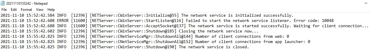 2021-11-10 15:52:22.489 INFO [13348] [NETServer::CWinServer::Initialize@55] The network service is initialized successfully.
