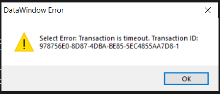 The app uses an MDI interface and so windows are opened as sheets -- i.e. OpenSheet(windowname, w_mdi, 0, Original!), Two of the windows I'm testing have tab controls with 4 tab pages each. When I open the first window things work fine and I can go from tab to tab and the retrieval for each datawindow on the tab pages works as expected. However, as soon as I open another sheet from the main menu and then start navigating the various tabs in the two open windows, I am hit with an error that says the transaction has timed out -- see attached. I believe this error originates from the web api, not the PB code. Does anyone have any suggestions on 1) what is causing this and 2) how to resolve it?