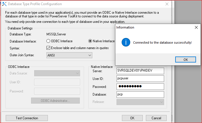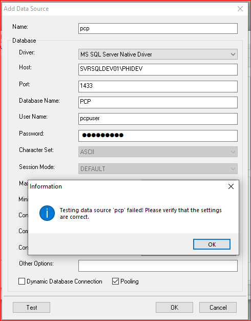 (Note. after clicking Test, it takes about 2-3 mins before the Information popup appears)