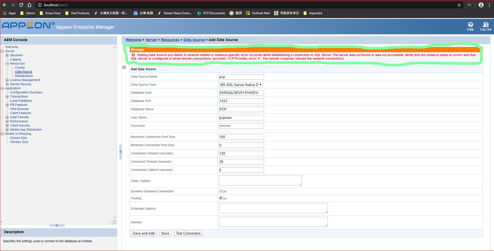 "you will need to contact Appeon support. localhost is your local computer. I was able to verify ODBC connections via native driver 11 and ODBC SQL to the server using local accounts on the SQL server from my computer away from office over VPN. We do not have any licensing information or ability to work with this software as you are the only one with a copy on your computer. I suggest contacting the company directly for support."