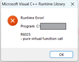 We are facing issue with R6025 Error - Pure virtual function call stating the Error title as Microsoft Visual C++ Runtime Library while running application build using Powerbuilder 2019 R2 Build 2353.