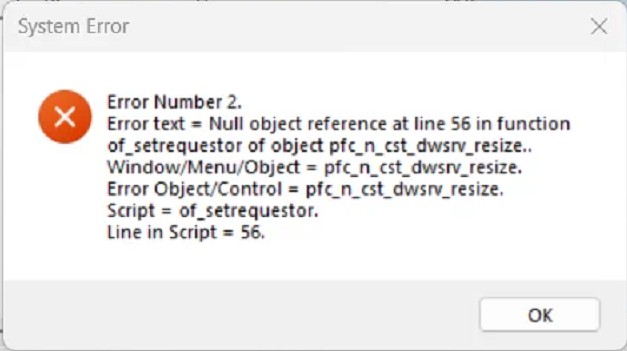 The product was developed using PB2022 R3 Build 3356. The runtime engine installed is 22.2.0.3397. Customer is installing on Windows 11 Pro (64-bit), Version 24H2, OS build 26100.7623. The app version they are running is 64 bit. (I have 32 and 64 bit versions). The error closes my app.