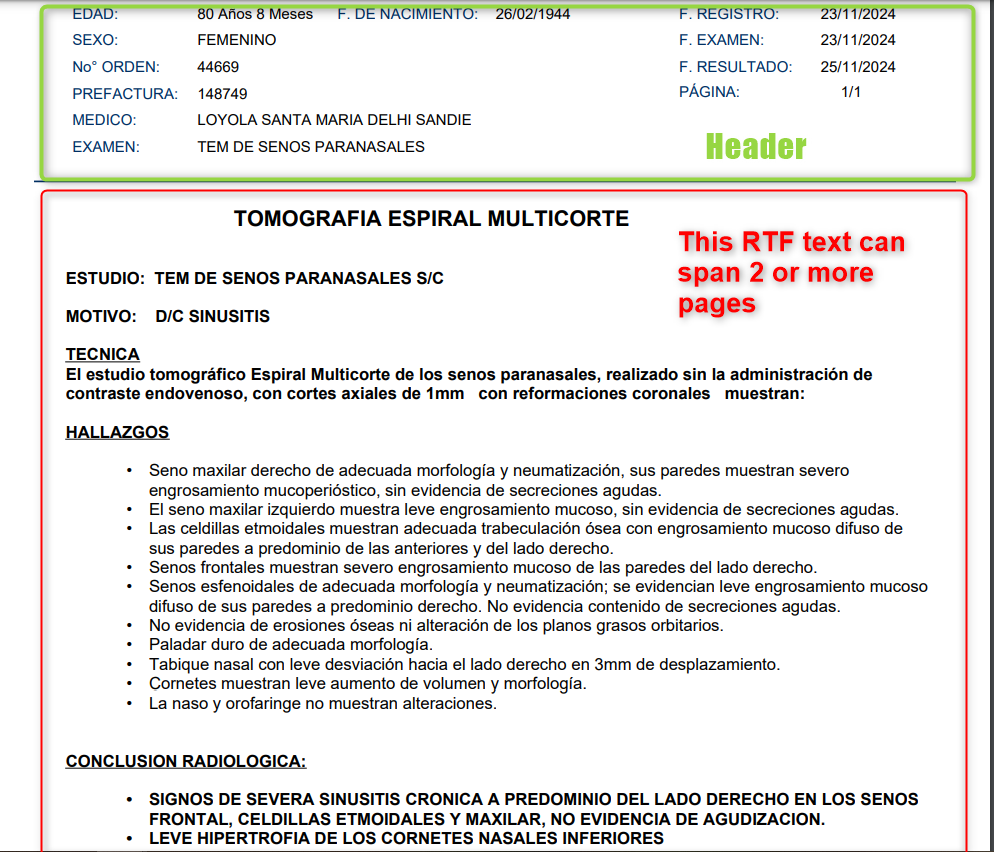 Hi, I am using PowerBuilder 2022 R2 and I currently have reports stored as RTF in a text-type field in a SQL Server 2022 table. I need to display these reports in a datawindow so that the user can print or export them to PDF. These reports can be somewhat lengthy... 3 or more pages. Does anyone know how to do this?. I am attaching an image of the report that I need to show.