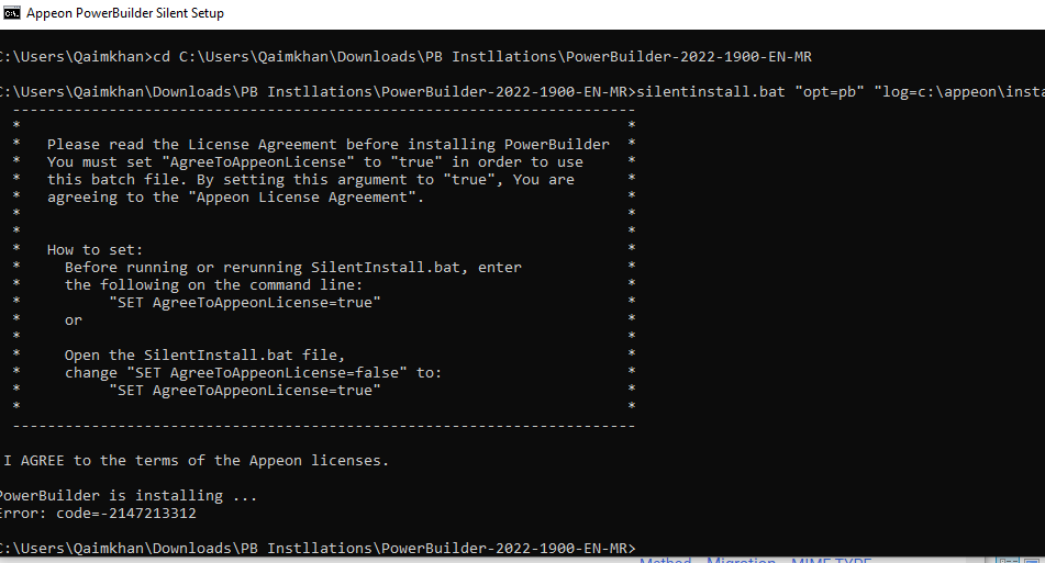 - Also I downloaded PowerBuider Utilities only, and getting following error while running silentinstall.bat "opt=pb" "log=c:\temp\appeon-install.log"