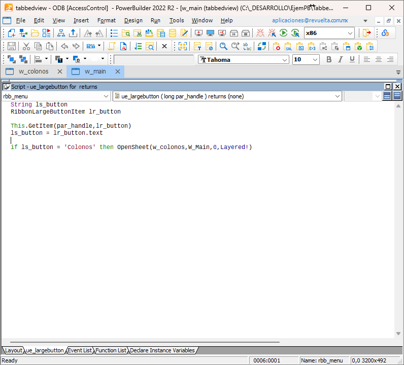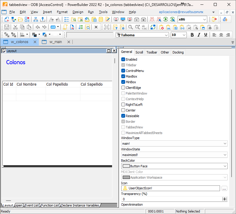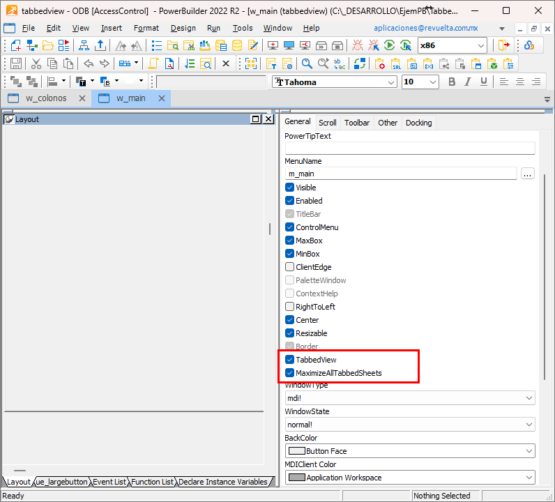 Defina a main windows calle w_main, mdi type with TabbedView checked.