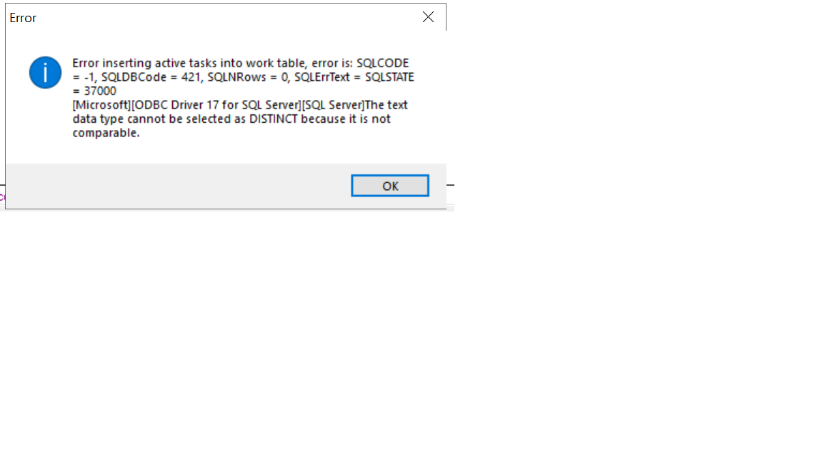 Error inserting active tasks into work table, error is: SQLCODE = -1, SQLDBCode = 421, SQLNRows = 0, SQLErrText = SQLSTATE = 37000