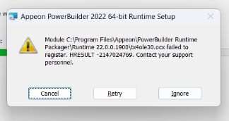 Installing Appeon Runtime 2022 64 via msi, it fails on a customers PC. I get an error message shown below.