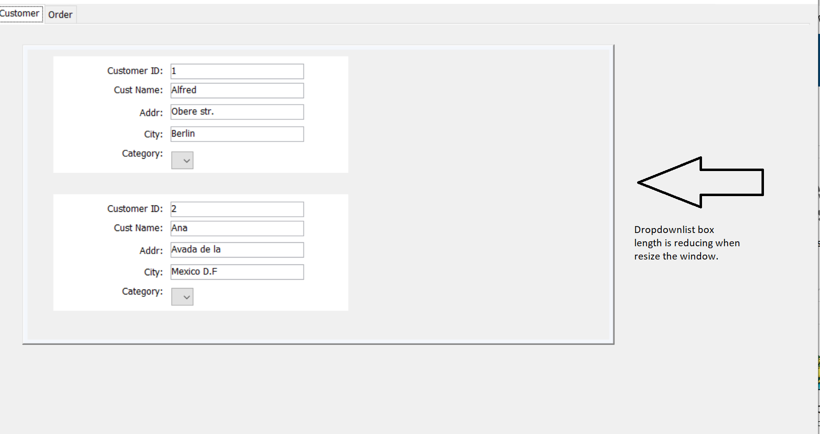 I've created one sample application to show the issue that occurring when resize the window, DDLB length is reducing.