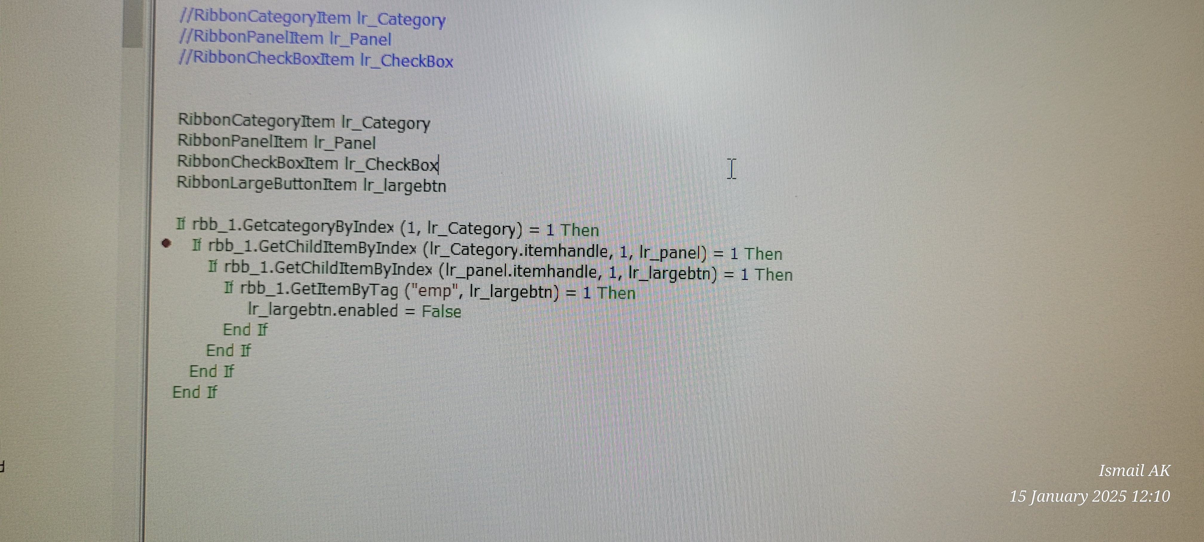 Using XML file for loading the all menus and image buttons into the ribbonbar, it is working but unable to do the disable and enable thorugh the PB script. If directly changed the enabled property in the XML file, its working as expected and If debuging code it is returning correct expected values too. I don't know how to proceed further?