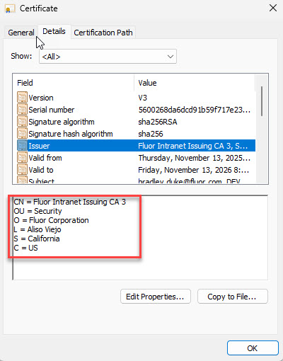 ls_certIssue = 'CN = Fluor Intranet Issuing CA 3~r~nOU = Security~r~nO = Fluor Corporation~r~nL = Aliso Viejo~r~nS = California~r~nC = US'