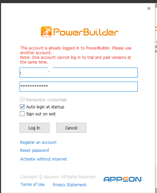 I am using PowerBuilder 2021 with license (IDE for development), when i switched to new laptop and downloaded PowerBuilder from Appeon and tried to login , getting error message Account is already logged in , I have already logged out of old machine.