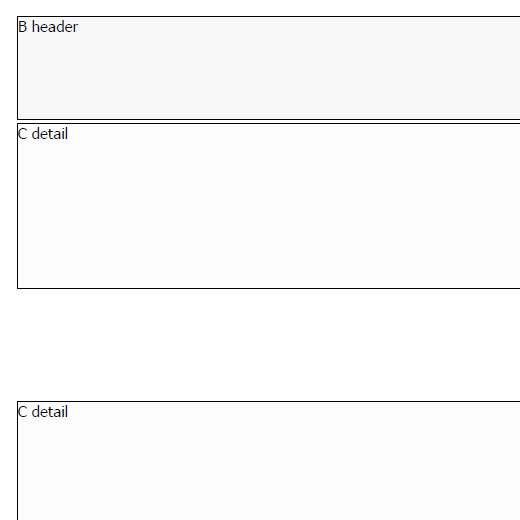 Report B has a header, and in details band has many copies of C so that report B does not fit a single page (in real life there are many different reports, this is just for simplicity).
