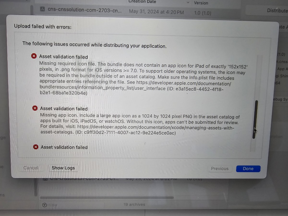 Missing required icon file. The bundle does not contain an app icon for iPhone / iPod Touch of exactly '120x120' pixels, in .png format for iOS versions >= 7.0. To support older versions of iOS, the icon may be required in the bundle outside of an asset